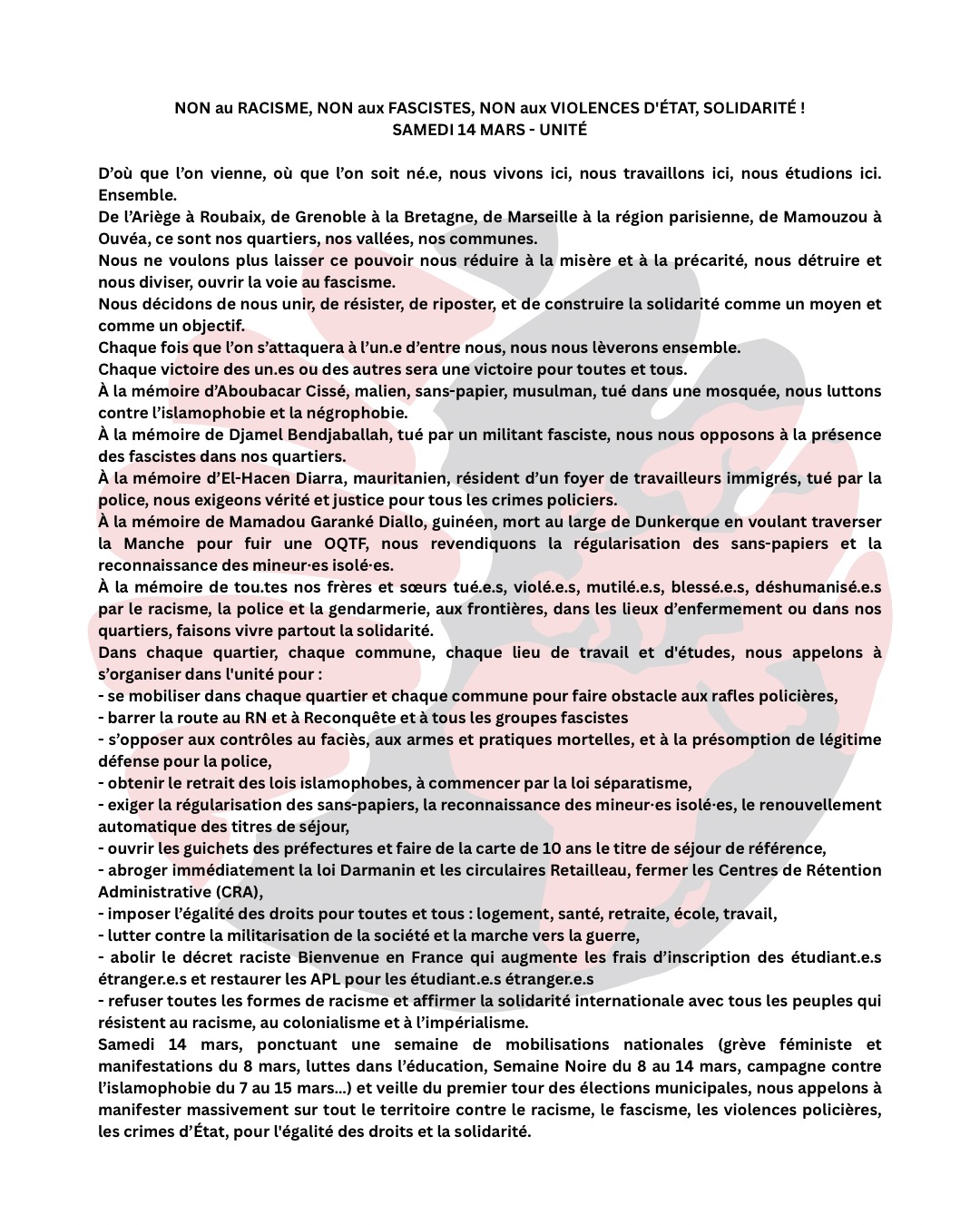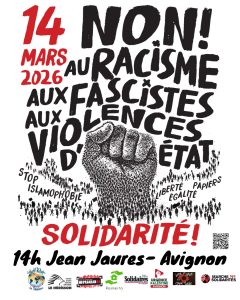 Non au racisme, non aux fascistes, non aux violences d’Etat. Solidarité-Unité.Samedi 14 mars 2026 Avignon, cours Jean Jaurès à partir de 14h